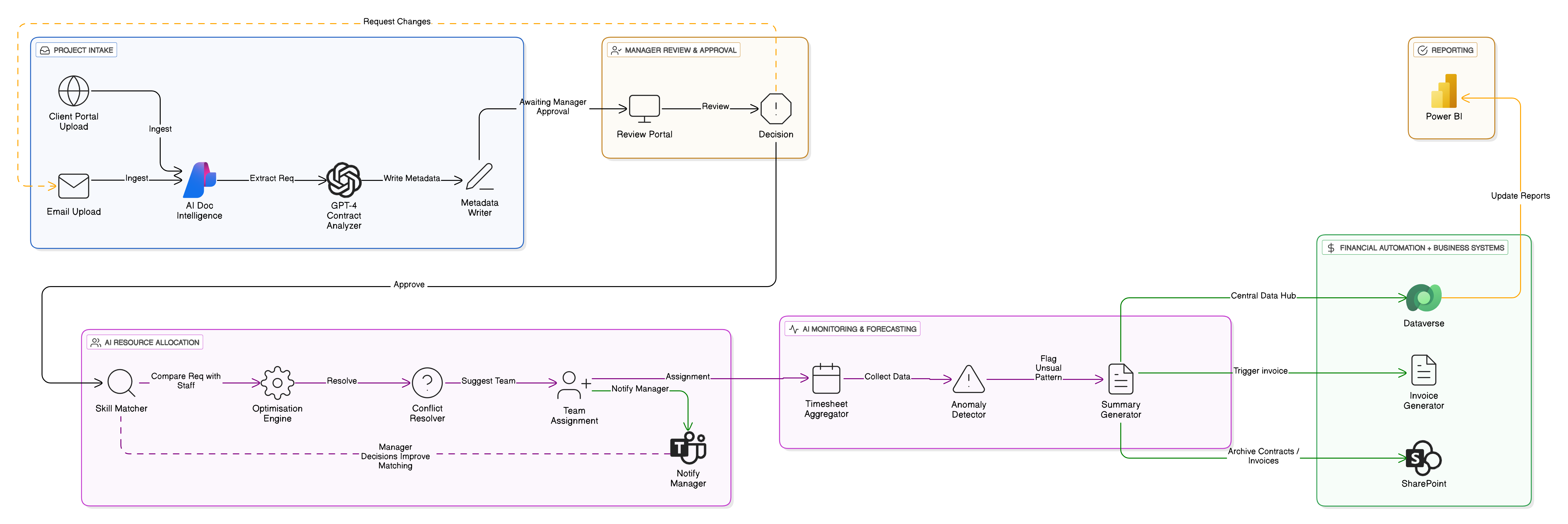 GPT-4 system analysing project requirements against team skills, availability, and preferences. Proactive workload monitoring.
