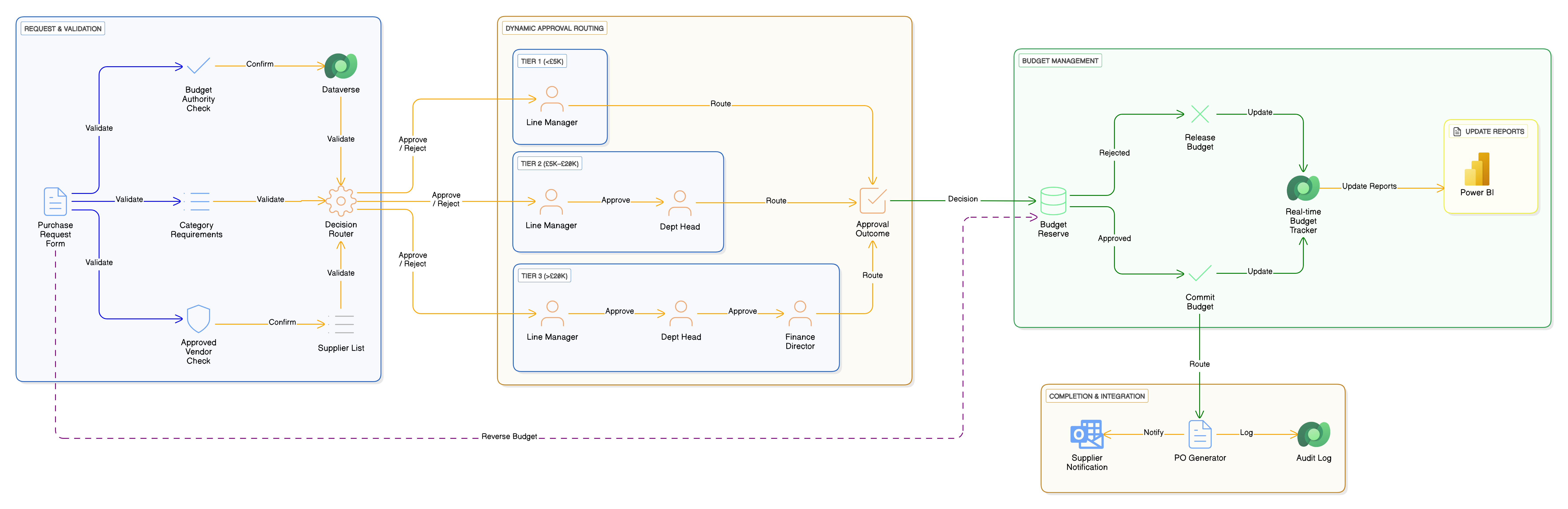 Dynamic approval routing based on value, department, and budget. Real-time budget visibility. Automated notifications and escalations.